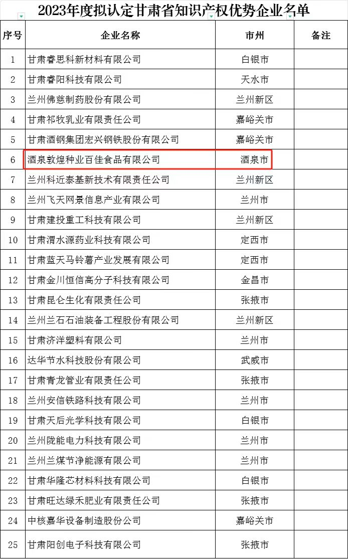 喜訊傳來!酒泉敦煌種業(yè)百佳食品有限公司榮獲“甘肅省知識產(chǎn)權(quán)優(yōu)勢企業(yè)”稱號